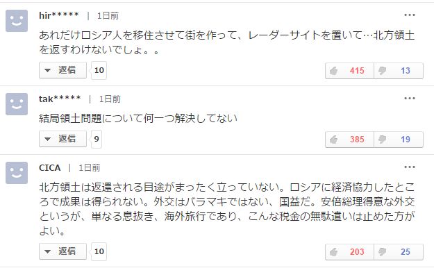 日本首相安倍晋三5月26日与俄罗斯总统普京在克里姆林宫举行首脑会谈。外媒报道称,安倍此行目的在于推动北方四岛(俄称南千岛群岛)共同经济活动,以期在领土问题上取得进展,推动日俄和平条约的签订。在之后的记者会上,安倍强调“如果日俄合作,将给双方带来巨大利益”,但日本媒体却纷纷批评此次会谈“成果匮乏”,更有网友留言称“北方领土完全没有返还的迹象,对俄罗斯的经济合作也取得不了成果。安倍总理得意的外交更像是海外旅行,请别这么浪费我们的税款。”