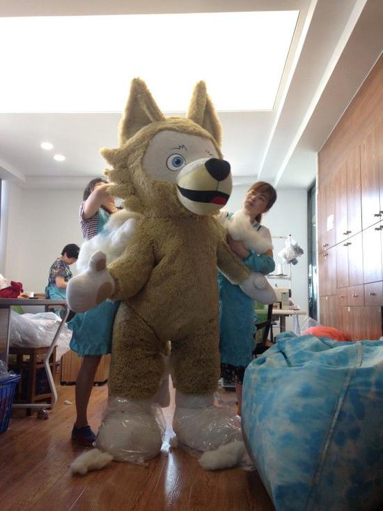 最后的充棉是技术难题。钢结构的玩具要显得可爱,棉得充的厚实,还得均匀。最终小分队几乎是爬到玩具内部进行充棉,俞大姐说:“这要是一不小心把我缝进去,我就跟着这个大狼去俄罗斯啦”。