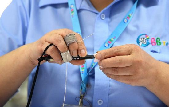 图:刘爱敏在车间手工缝制世界杯吉祥物。
