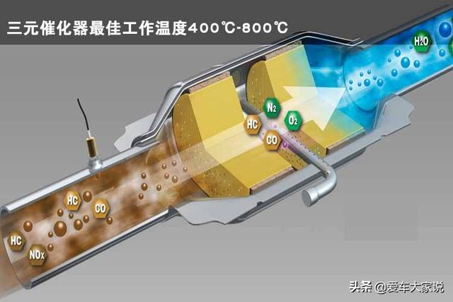 三元催化器就藏在排气管前段,发动机排出的尾气都要经过三元催化器。在这里三元催化器把尾气中的有害物质进行氧化还原,变成无害物质。但是三元催化器必须在一定的高温下才能正常工作。冷启动时三元催化器冰凉冰凉,根本无法净化尾气。