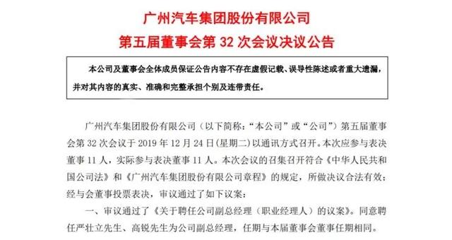 与上汽集团宣布合作之后,广汽集团再次公布两项人事任命。12月24日晚,广汽集团发布公告,同意聘任严壮立、高锐为公司副总经理。