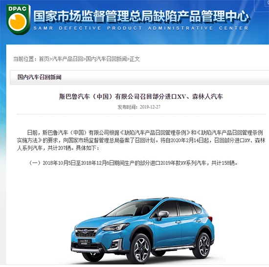 此外,斯巴鲁中国将自2020年2月14日起,召回部分进口XV、森林人系列汽车,共计207辆。其中,2018年10月5日至2018年12月6日期间生产的部分进口2019年款XV系列汽车,共计158辆;2018年10月8日至2018年12月7日期间生产的部分进口2019年款森林人系列汽车,共计49辆。