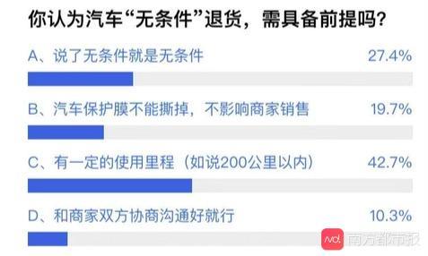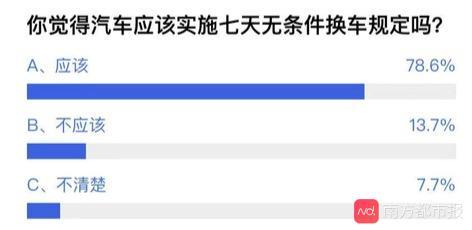那么,汽车是否应该实施“七天无条件退货”,也成为了人们关注的焦点。在南都汽车发布的民意调查中,大多数受访民众都支持“无条件换车”的规定,更有部分消费者认为汽车退换期时间应该更长。