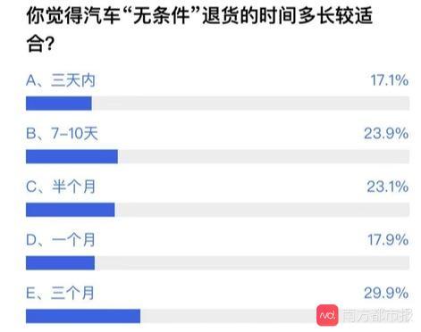 毕竟,汽车不同于网购商品,究竟这种“无条件退货”的使用时间多长合适?对此,人们显然觉得七天还不足够。有多达29.9%的消费者认为退货时间应该为“三个月”,“7-10天”以及“半个月”的,分别占比23.9%和23.1%,觉得需要“一个月”及“三天内”的,分别占17.9%、17.1%。