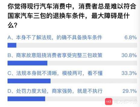 众所周知,购车后,一旦车辆出现问题,能够成功退换车的毕竟是少数人。那么,究竟是什么原因导致人们不能享受到国家汽车三包退换车政策?有30.8%受访者认为,是因为经销商阻挠消费者享受到三包政策。33.3%受访者认为是政策本身含糊不清,模棱两可,让自已看不懂;也有29.1%的消费者归咎于处罚力度太轻,商家本身也强势。只有6.8%的人认为是自已对法规内容掌握不清楚,的确不具备退换车条件。