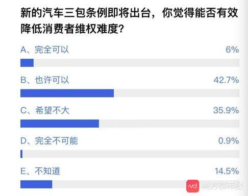 正因为在现行国家汽车三包规定下,消费者“退换车”的诉求依然难以得到合理对待。因此,对于新版本的汽车三包规定"能否降低人们维权难度",人们还是持谨慎乐观态度。42.3%的消费者觉得“也许可以",认为“希望不大”的有35.9%,表示“不知道”的也有14.5%,觉得“完全可以”及“完全不可能”的分别占据6%、0.9%。