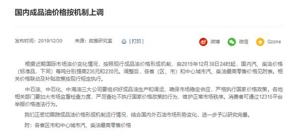 经济日报-中国经济网北京12月30日讯 据国家发改委网站消息,根据近期国际市场油价变化情况,按照现行成品油价格形成机制,自2019年12月30日24时起,国内汽、柴油价格(标准品,下同)每吨分别提高235元和230元。调整后,每吨汽油上调235、柴油上调230元,折合每升89#0.17元、92#0.18元、95#0.19元、0#0.20元。由此,加满一升油将多花约9元。