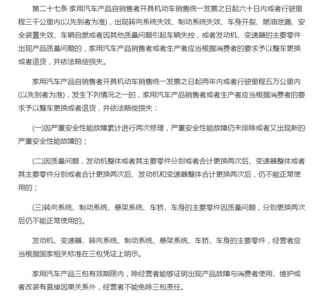 和国家质量监督检验检疫总局发布的《家用汽车产品修理、更换、退货责任规定》,也就是常说的“汽车三包政策”相比,“浙版新消法”最大的亮点在于,汽车免费退换条件范围扩大了。