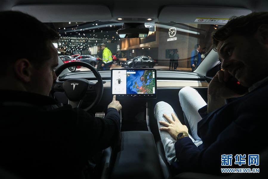 1月9日,在第98届比利时布鲁塞尔车展上,人们体验特斯拉Model 3电动汽车。