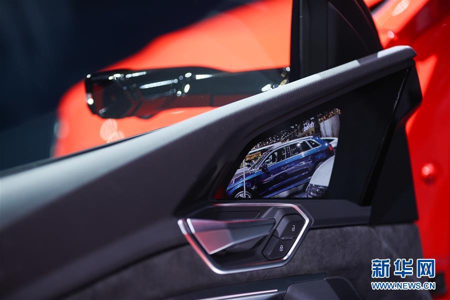 这是1月9日在第98届比利时布鲁塞尔车展上拍摄的奥迪e-tron 55 quattro汽车内的虚拟后视镜显示屏幕。