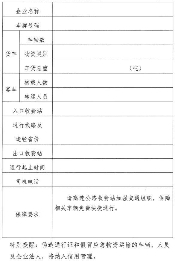 (三)通行证使用。落实绿色通道政策,确保持有通行证的车辆“不停车、不检查、不收费”,优先便捷通行。A证按照“一车一证、一次一证、车证一致”的原则使用,通行起止时间不得超过一趟次运输任务所需时间。B证按照“企业支配、车不定证、每车必带、出车报备”的原则使用,有效期由证件发放部门根据需要确定。执行应急运输任务的车辆应随车携带通行证。执行应急运输任务的车辆去程或返程空载的,均免收全程车辆通行费。