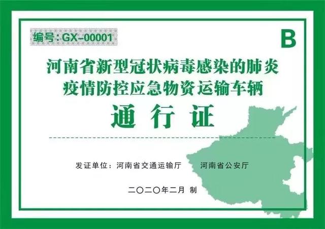 2.河南省新型冠状病毒感染的肺炎疫情防控应急物资运输车辆通行证(B证式样)
