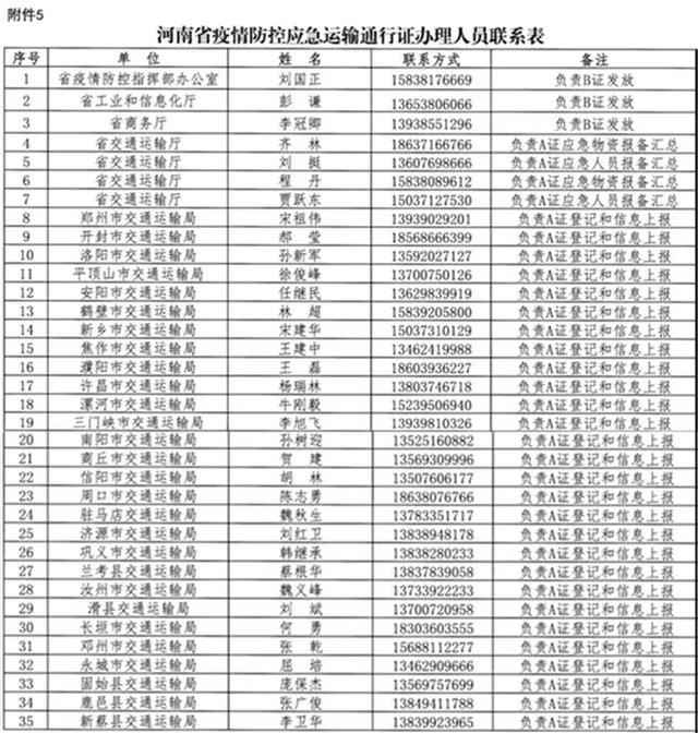 5.河南省疫情防控应急运输通行证办理人员联系表
