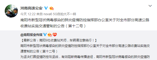 南阳市新型冠状病毒感染的肺炎疫情防控指挥部办公室关于对全市部分高速公路收费站实施交通管制的公告(第十二号)