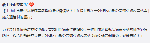 为坚决打赢疫情防控攻坚战,有效阻断病毒传播途径,平顶山市新型冠状病毒感染的肺炎疫情防控工作指挥部研究决定,对辖区内部分高速公路收费站实施交通管制措施,现通告如下: