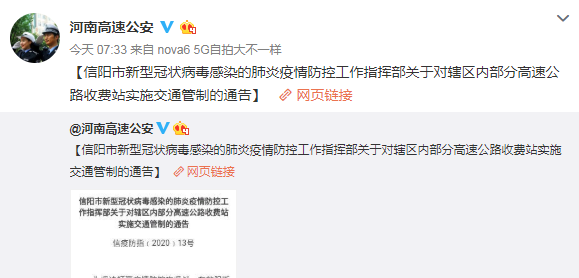 为坚决打赢疫情防控攻坚战,有效阻断病毒传播途径,信阳市新型冠状病毒感染的肺炎疫情防控工作指挥部研究决定,对辖区内部分高速公路收费站实施交通管制措施: