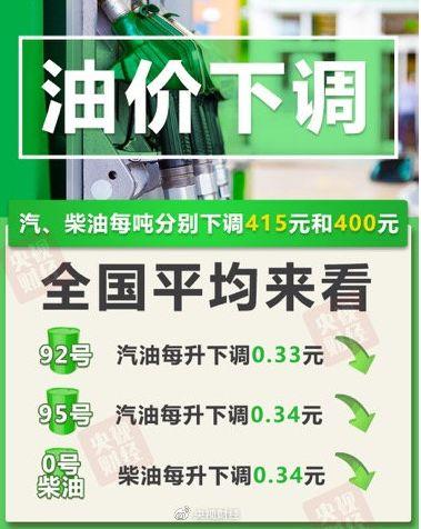 全国平均来看:92号汽油每升下调0.33元;95号汽油每升下调0.34元;0号柴油每升下调0.34元。