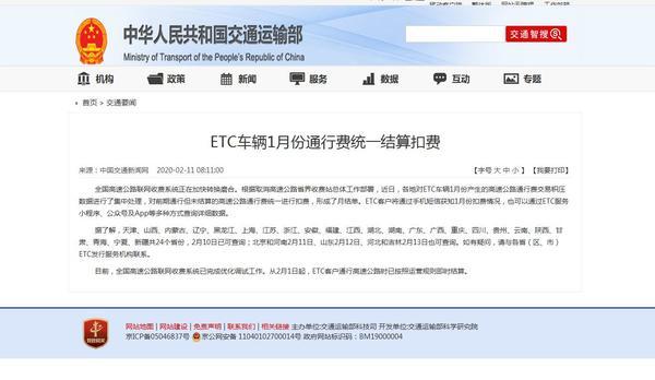 此外,记者注意到,2月11日,交通运输部曾发布公告,近日,各地对ETC车辆1月份产生的高速公路通行费交易积压数据进行了集中处理,对前期通行但未结算的高速公路通行费统一进行扣费,形成了月结单。目前,全国高速公路联网收费系统已完成优化调试工作。从2月1日起,ETC客户通行高速公路时已按照运营规则即时结算。