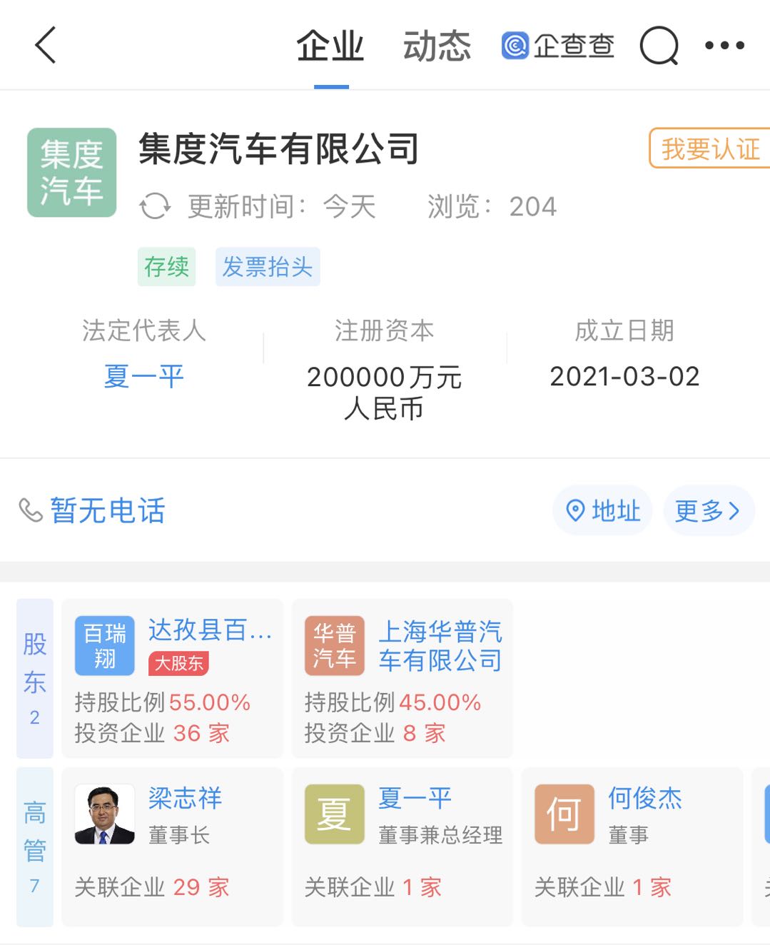 企查查App显示,3月2日集度汽车有限公司成立,注册资本20亿元人民币,法定代表人为夏一平,经营范围包含新能源汽车整车及相关零部件的技术服务、技术开发、技术咨询、技术交流、技术转让、技术推广;汽车零部件及配件制造等。企查查股权穿透显示,该公司由达孜县百瑞翔创业投资管理有限责任公司(百度关联企业)和上海华普汽车有限公司(吉利控股关联企业)共同持股。