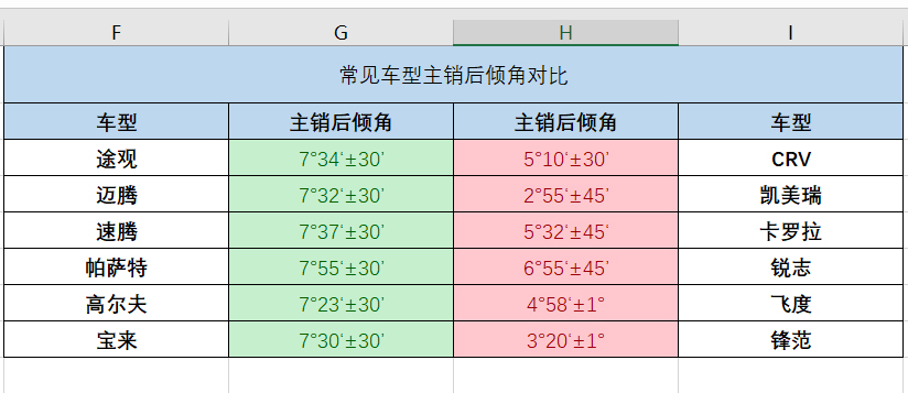 上图中我统计了几款日系车和德系车的主销后倾角数据,从中可以看到这几款日系车主销后倾角普遍偏小。因此这几款车跑高速时保持直线行驶的能力就不如主销后倾角大的车了,也更容易让人产生“方向盘不受控”的感觉。