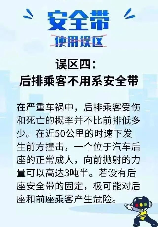 殊不知当车辆发生交通事故时,后排乘坐人如未系安全带,因没有安全气囊的缓冲和保护,可能会撞击到前排座椅、顶棚、前挡风玻璃、仪表台,甚至被直接甩出车外,严重威胁自身和前排驾乘人的生命安全。