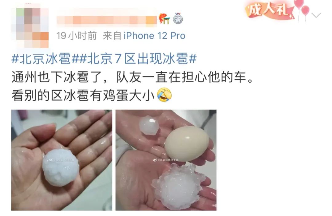 6月12日晚,北京密云、东城、昌平、通州等多个区,局部出现冰雹。北京冰雹开启了霸屏模式,网友们晒出拍到的冰雹足足有鸡蛋大小。