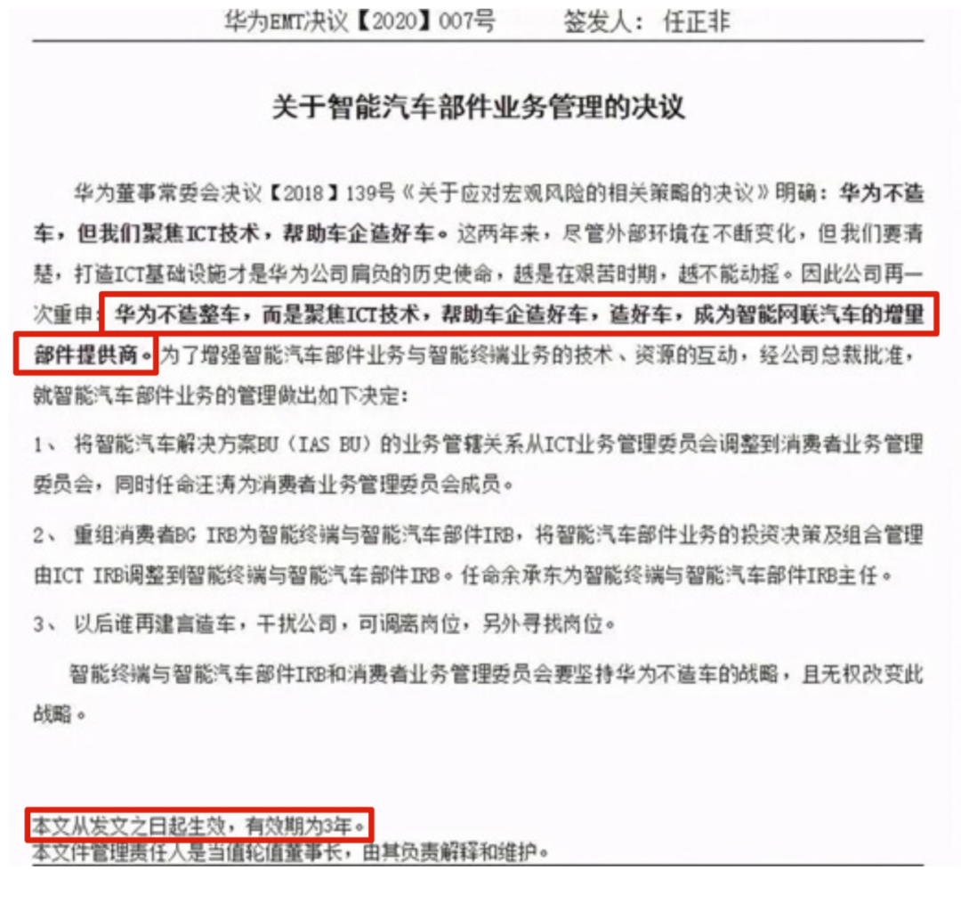 要知道,参考20年华为董事常委会的决议,华为不造整车的承诺期限是3年。