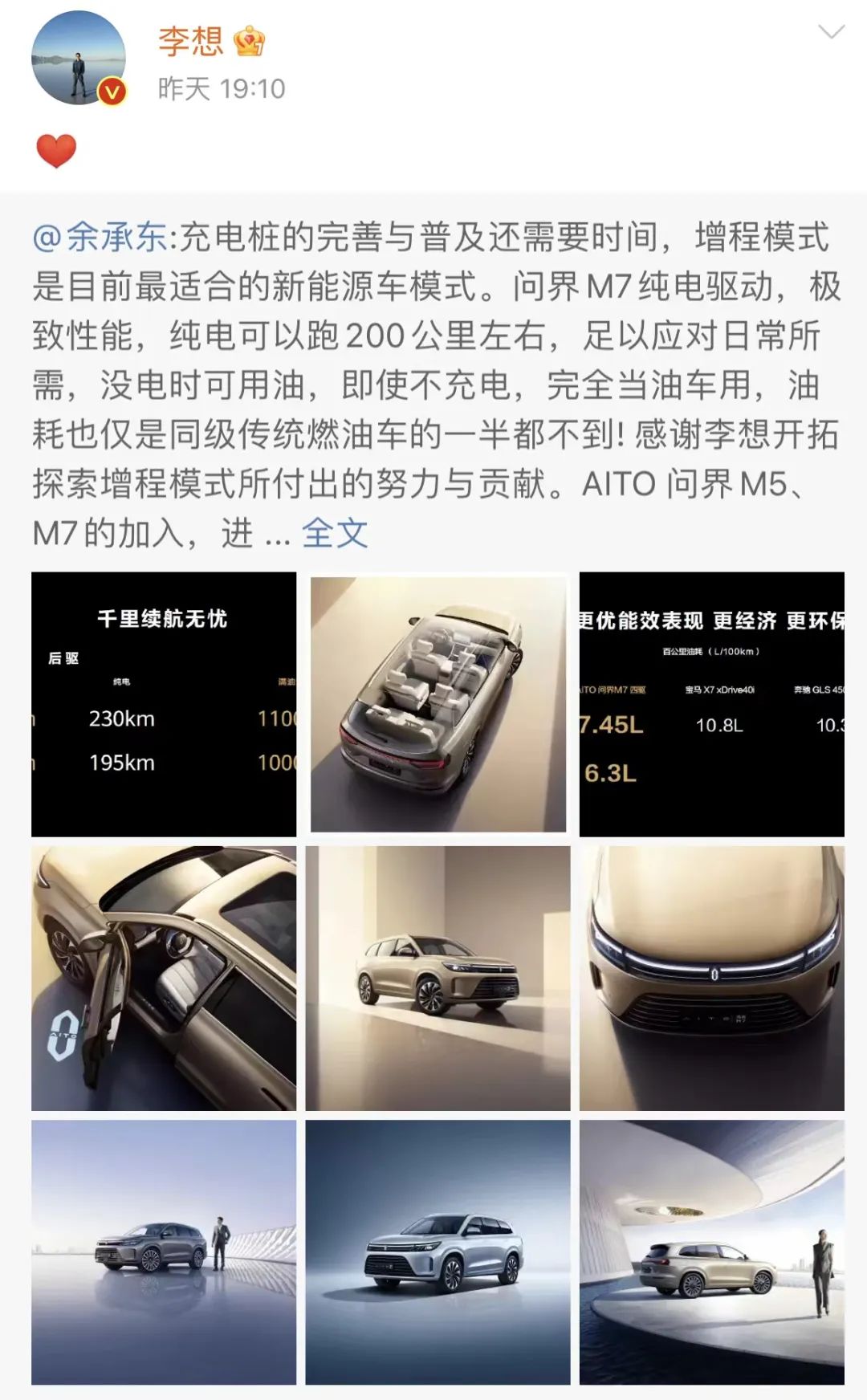 余大嘴接过了李想“增程吹”的接力棒,在微博直呼“增程模式是目前最适合的新能源车模式,即便不充电,油耗也仅仅同级传统燃油车一半不到”。