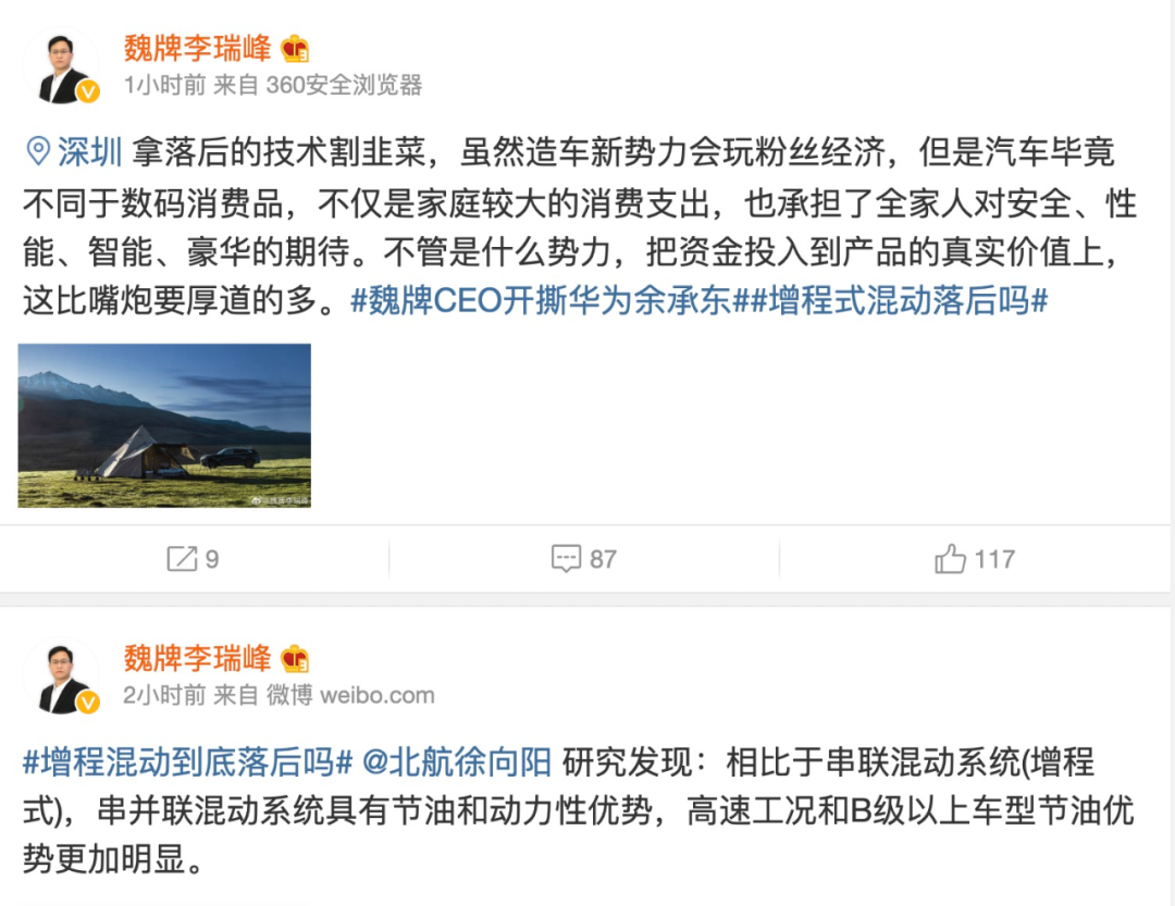 李想转发了“战友”的微博,并给余承东比了个心。长城魏牌汽车 CEO 李瑞峰也转发了微博,不过表达的满是“我想不通”。