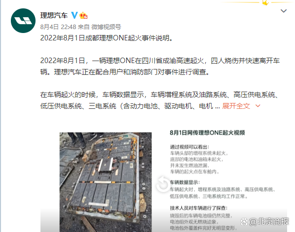 2022年8月1日成都理想ONE起火事件说明。2022年8月1日,一辆理想ONE在四川省成渝高速起火,四人烧伤并快速离开车辆。理想汽车正在配合用户和消防部门对事件进行调查。在车辆起火的时候,车辆数据显示,车辆增程系统及油路系统、高压供电系统、低压供电系统、三电系统(含动力电池、驱动电机、电机控制器)均工作正常,无任何电路短路和燃油泄露问题,车辆电压、电流及燃油压力均无异常。技术人员对车辆进行了探查:车辆电池组完整,电池组外观无燃烧迹象,电池包外覆盖件完好无明显变形,电池组内部泡沫缓冲件无燃烧迹象。车辆油箱完整。根据目前掌握的信息,我们认为起火并非由车辆质量问题引起,理想汽车将配合消防部门调查车辆具体的起火原因。根据车辆燃烧前的车辆数据显示:13时17分55秒,车速85km/h,车辆空调系统AC打开,传感器显示车外温度24℃(下雨),车内第二排温度32.5℃;13时17分57秒,车内第二排温度瞬间升高至85℃;13时18分01秒,车内PM2.5数值由14开始快速拉升至999;13时18分04秒,驾驶员打开左前车门,随后车辆右前、左后车门打开,车内乘客座椅占位信号消失,车内人员全部离开车辆。通过对起火视频和车辆数据的综合分析: