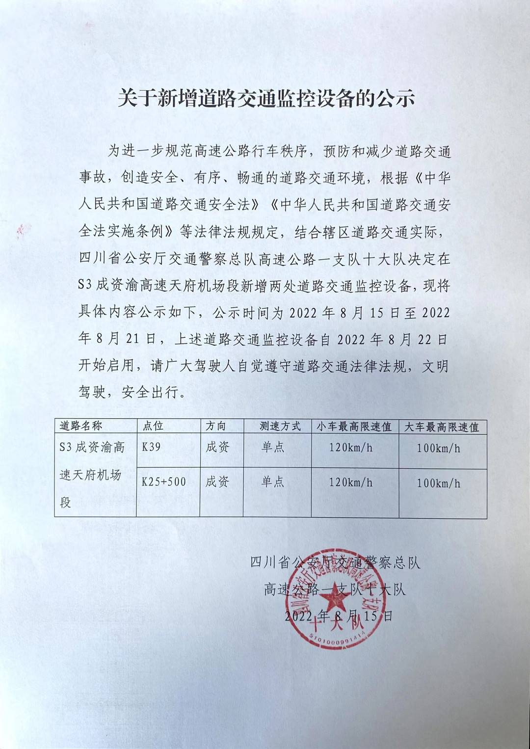 8月16日,封面新闻记者从四川省公安厅交警总队获悉,为进一步规范高速公路行车秩序,预防和减少道路交通事故,创造安全、有序、畅通的道路交通环境,根据有关法律法规规定,结合辖区道路交通实际,四川省公安厅交通警察总队高速公路一支队十大队决定在S3成资渝高速天府机场段新增两处道路交通监控设备。据介绍,这两处道路交通监控设备自2022年8月22日启用,请广大驾驶人自觉遵守道路交通法律法规,文明驾驶,安全出行。