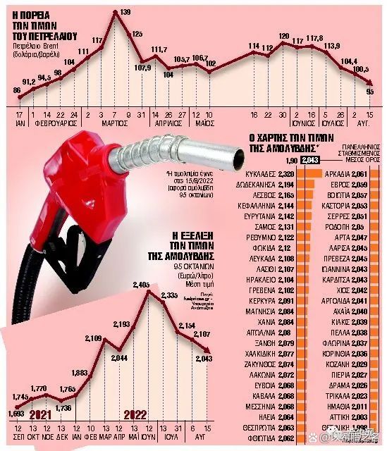 希腊无铅汽油的平均价格也在上周从7月中旬的2.405欧元降至每升 2.043欧元。不过,比起俄乌冲突和能源危机暴发前的平均每升1.690欧元的价格,目前希腊汽油价格仍居高位。