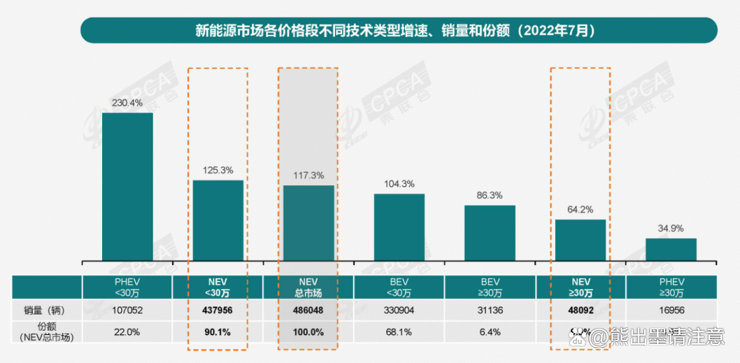 纵观新能源市场,7月份,在纯电车型里,30万元以上销量占比为9.9%,混动车型里其占比仅为6.4%。而且,参照燃油车市场的演变,新能源市场的销量结构后续也必定会走向“纺锤形”,即中端产品占据主流,高端趋向小众。
