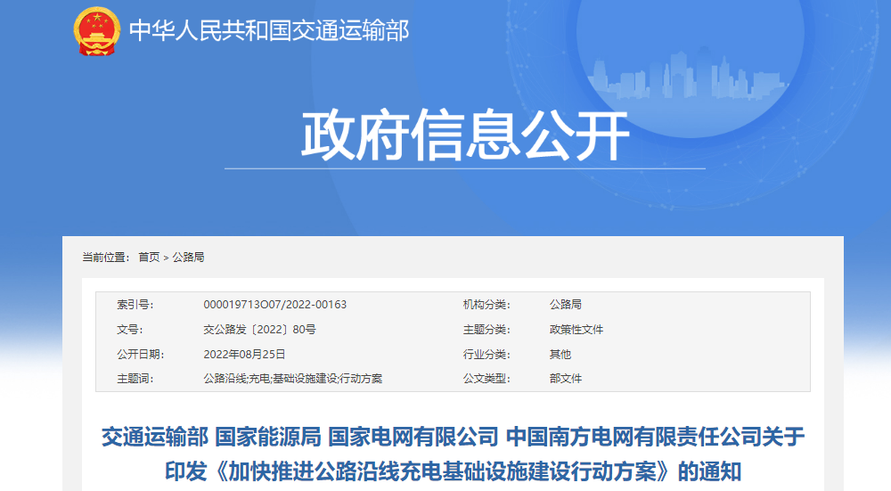 今天,交通运输部、国家能源局、国家电网公司、南方电网公司联合发布了《加快推进公路沿线充电基础设施建设行动方案》。