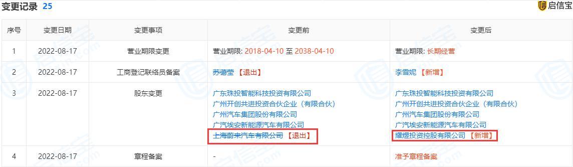 8月25日,《每日经济新闻》查阅启信宝发现,合创汽车科技有限公司(即合创汽车)于8月17日发生股东变更,上海蔚来汽车有限公司退出股东行列,退出前其持股比例约为4.4589%。