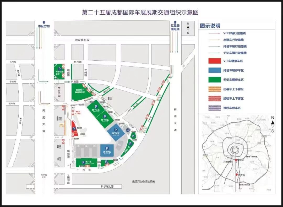 此次成都国际车展有8处检票口,分别设置在西博城1号门、2号门、3号门、6号门、8号门,地下AB入口、C入口、D入口,其中2号门为VIP入口。所有观众需戴好口罩,准备好票码和健康码,有序排队进场。