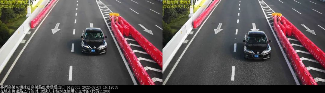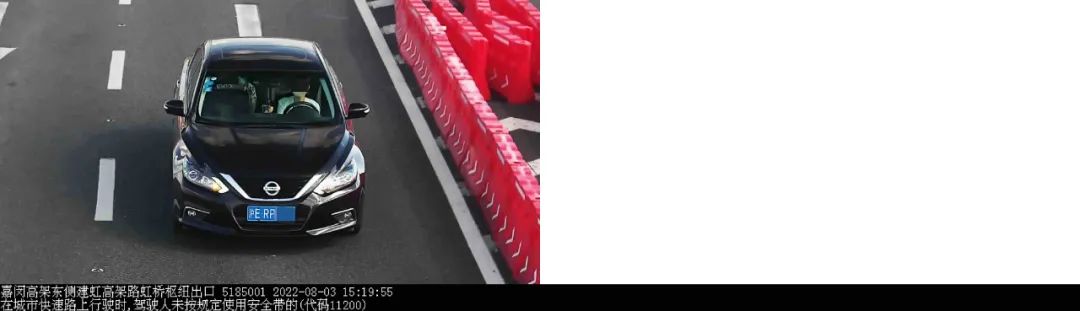 ▲2022年8月3日15时19分,号牌为沪ERP***的小型轿车在嘉闵高架东侧建虹高架路虹桥枢纽出口,实施了“在城市快速路上行驶时,驾驶人未按规定使用安全带的”违法行为。