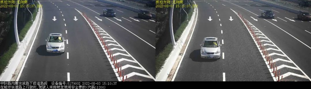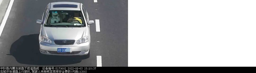 ▲2022年8月3日15时10分,号牌为沪BQQ***的小型轿车在中环路内圈古浪路下匝道路段,实施了“在城市快速路上行驶时,驾驶人未按规定使用安全带的”违法行为。