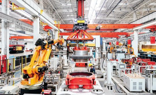 如今,走进三一重工桩机工厂,一座座重型设备鳞次栉比,AGV(无人搬运车)来去自如,机械手挥舞有序,偌大的工厂仿佛在演奏舒缓的“机器交响乐”。