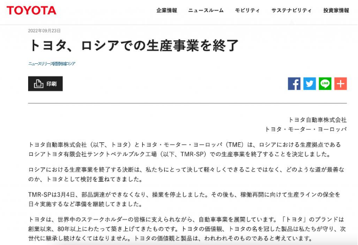 丰田在公告中表示,终止在俄罗斯生产业务的决定不是轻易做出的,丰田一直在寻求合适的解决方案,“今年3月4日,由于关键材料和零部件的供应中断,我们在圣彼得堡的工厂不得不暂停生产。从那时起,我们一直密切关注形势,并评估我们在俄罗斯业务的未来可持续性。在此期间,我们充分保留了劳动力,并确保设施能够在条件允许的情况下重新开始生产。但是,六个月之后,我们还未能恢复正常的活动,也没有看到今后可以重新开始的迹象。”