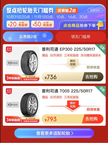 即日起至11月12日,用户在途虎养车APP下单购买轮胎,并选择配套安装服务时,针对已标记有“买贵赔差价”、“买贵2倍赔”等承诺标识的轮胎产品,用户可与其它特定线上官方渠道销售的同款同型号轮胎结算价进行比价,一旦发现买贵,则可申请2倍赔付。