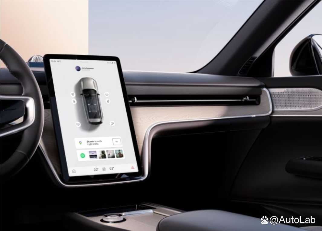 为此沃尔沃EX90的屏幕为车主定制了情景栏。不同情境,不同界面:当车主上车时,屏幕上会显示迎宾信息。当车辆处于驾驶状态,主屏幕信息将被更新为导航、媒体、电话和车机操控驾驶时所需的主要信息。