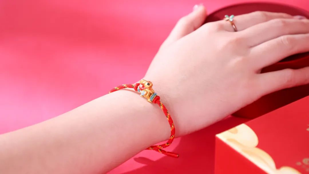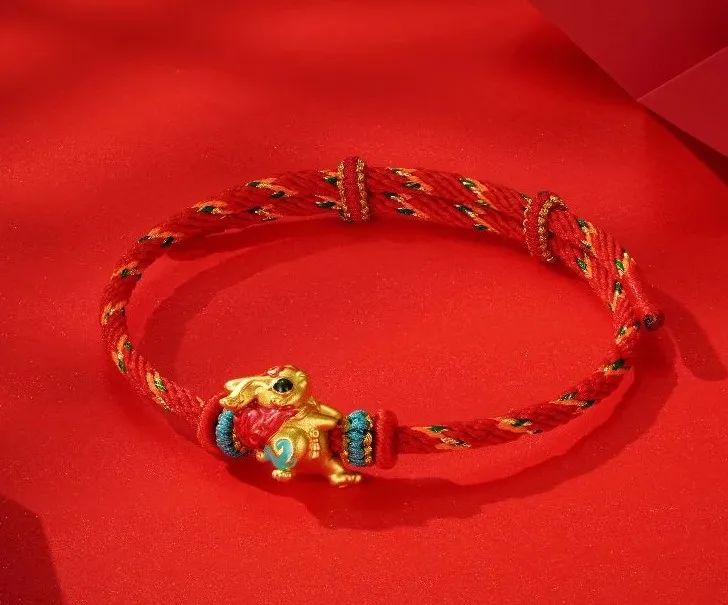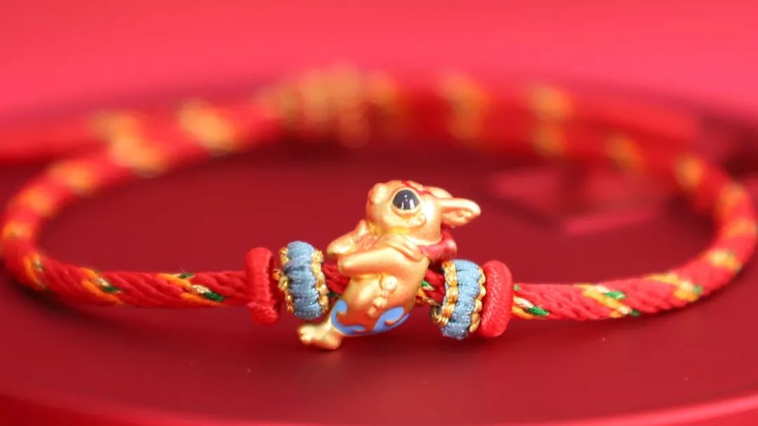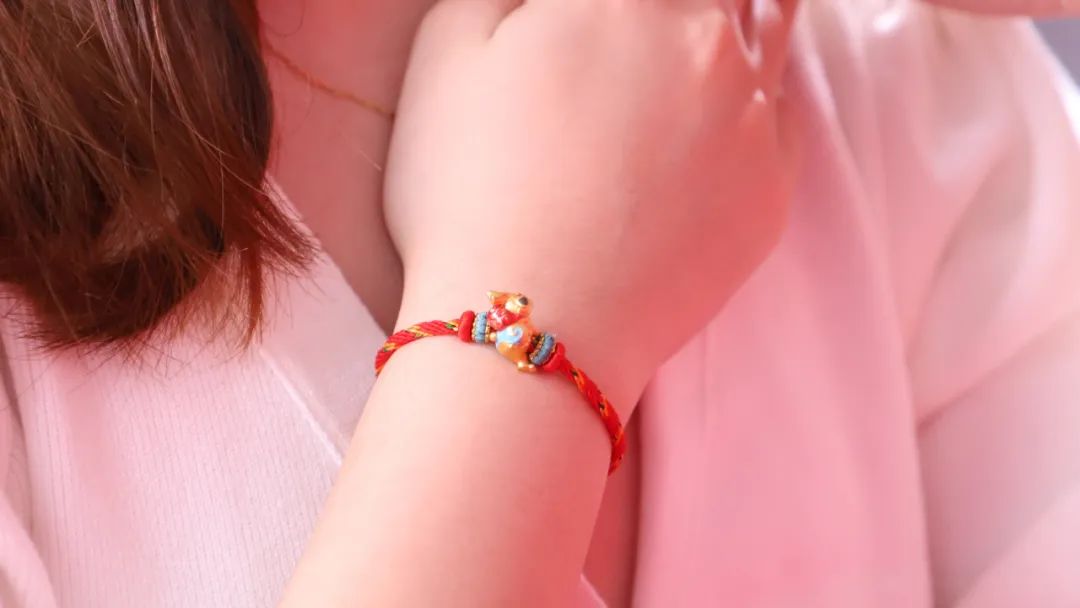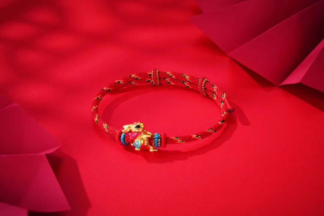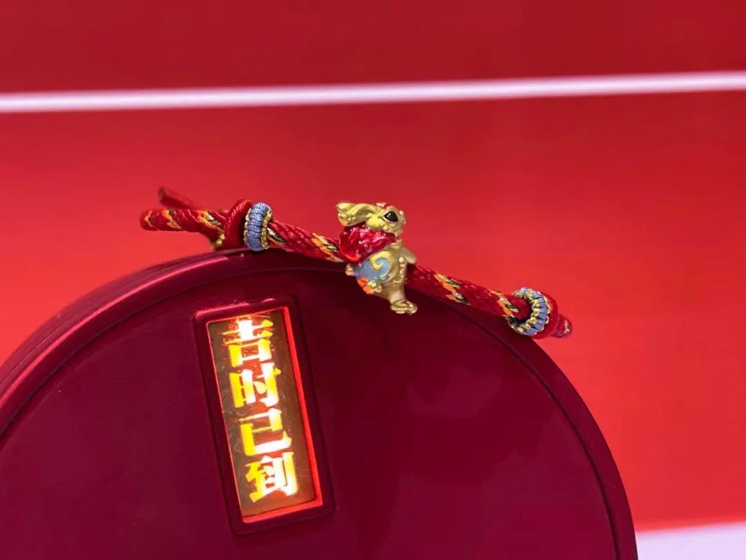与常规手串不同,《春晚生肖手串》的设计不再是“红绳挂吊坠”,而是将红绳与金饰合二为一。