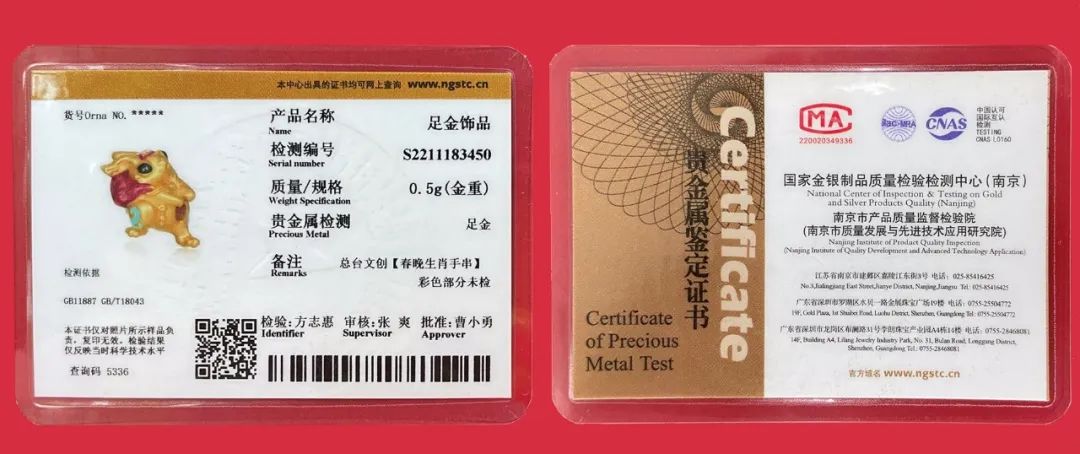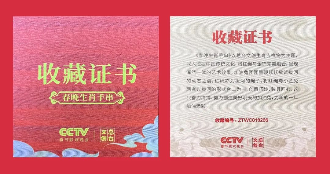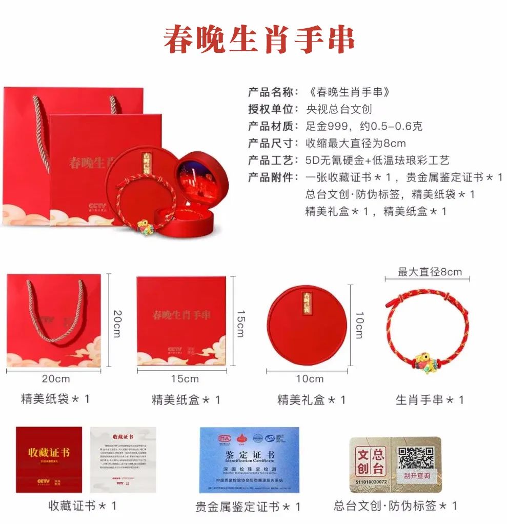 每一套《春晚生肖手串》都有一张收藏证书,一张贵金属鉴定证书和一张总台文创·防伪标签,官方正品。