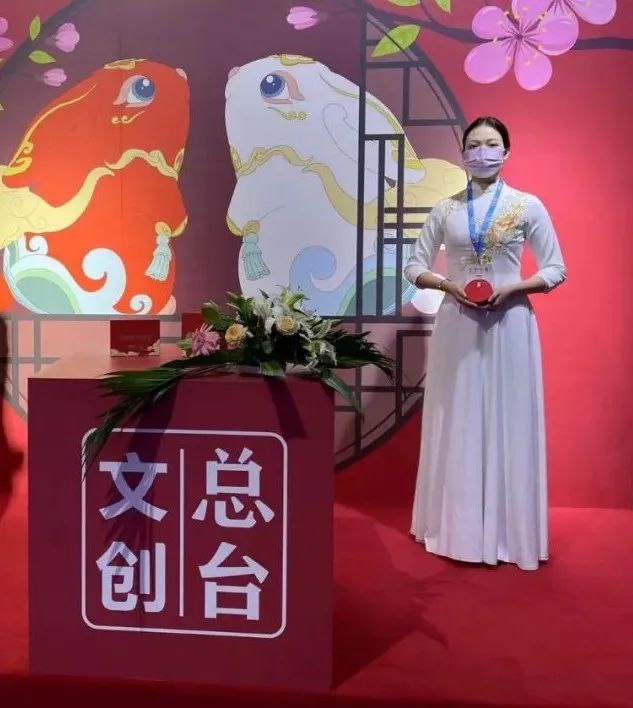 头顶的青铜器鸟纹寓意寓意“兔”飞猛进,眉间的如意纹花钿寓意吉祥诸事,胸前的石榴纹寓意多子多福,手上的铜钱纹寓意招财进宝、多福多金;
