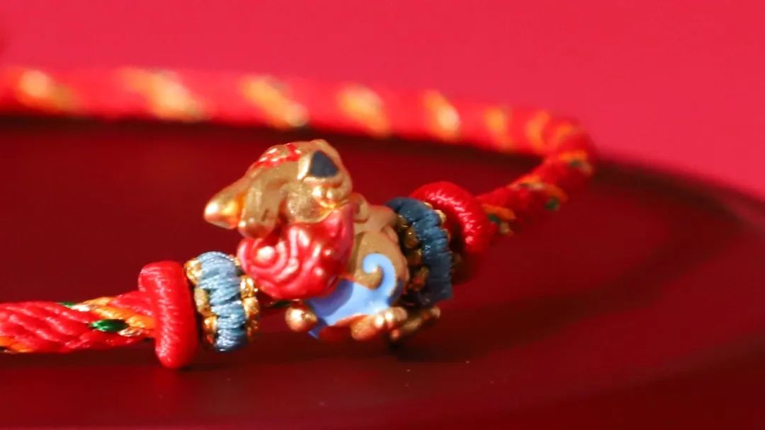 《春晚生肖手串》,将红绳与金饰融合,呈现出浑然一体的艺术效果。