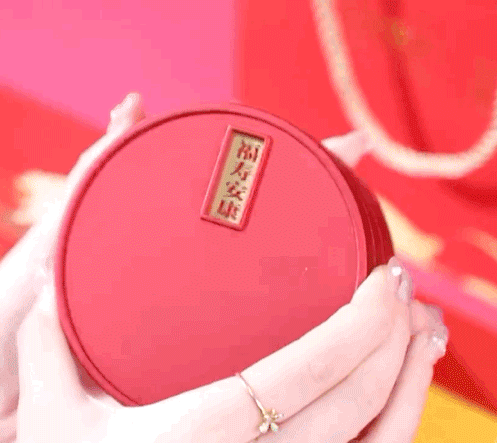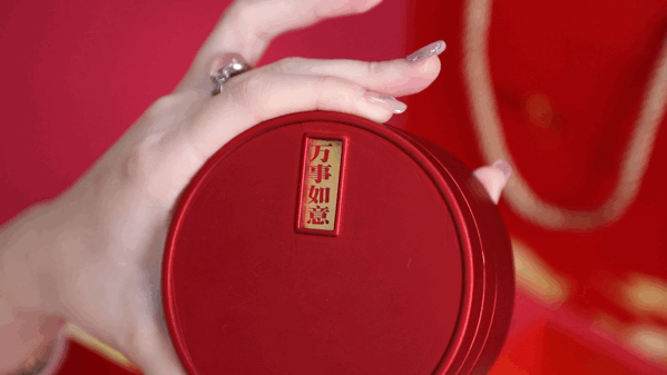 当你轻转盒盖时,会依次出现八个祝福语;当旋转到“吉时已到”时, 灯光同步亮起,寓意美好正式开始。
