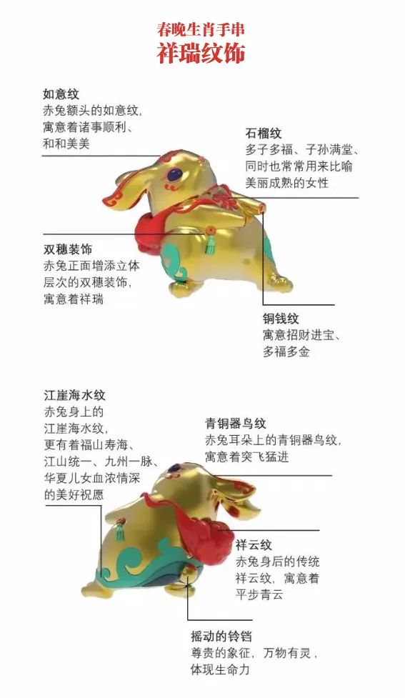 兔子背后为传统的祥云纹,寓意“兔”步青云,屁股后面为江崖海水纹,寓意福山寿海,象征着华夏儿女血浓情深,尾巴为铃铛样式,体现出鲜活的生命力。