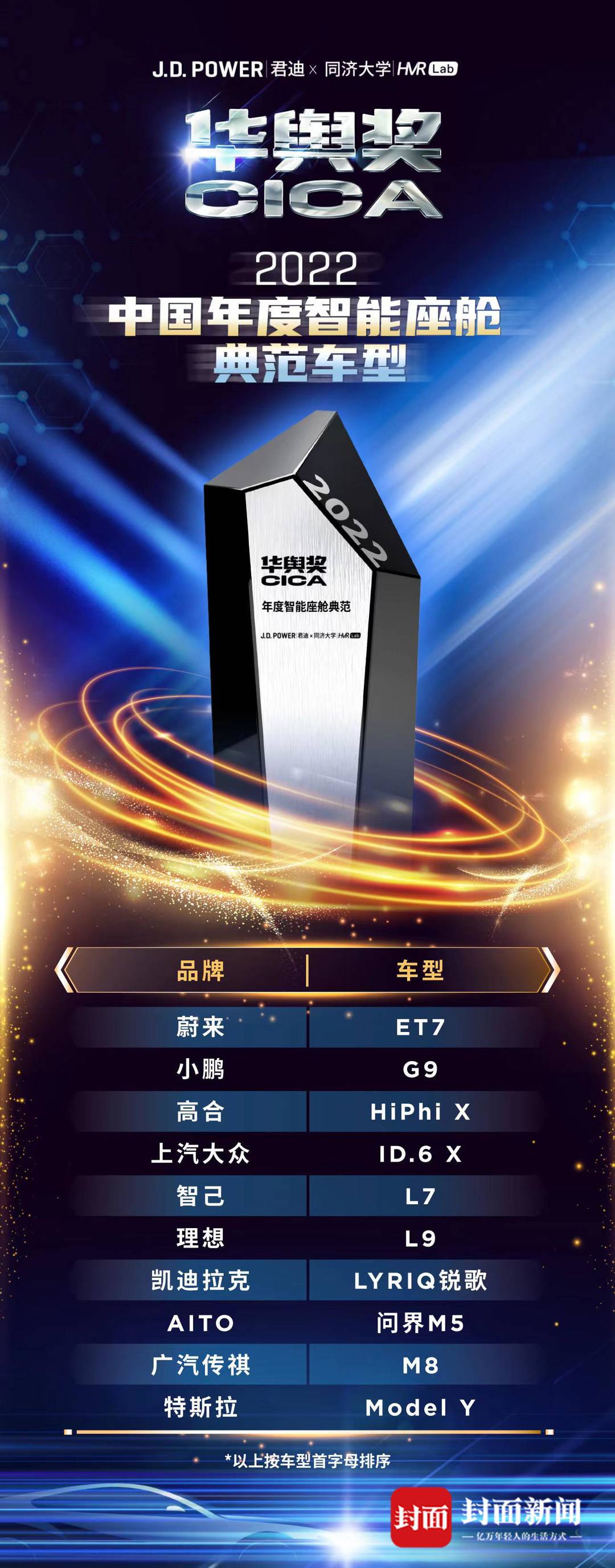 12月16日, 由J.D. Power | 君迪 与同济大学 HVR Lab(人车关系实验室)共同主办的“华舆奖·2022中国年度典范智能座舱”评选结果揭晓,十款车型脱颖而出摘得此项殊荣。