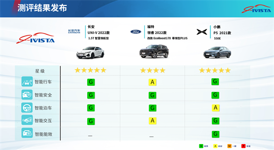 IVISTA中国智能汽车指数2020版测评体系根据智能汽车的功能特点,由智能行车、智能泊车、智能安全、智能交互、智能能效五个分指数组成。对于传统能源汽车仅测试前四项;对于新能源汽车,测试全部五项。IVISTA 2020版“智能星级”评定,根据各个分指数的评价结果综合评定。本次发布3款车型测评结果,分别是长安 UNI-V、福特领睿和小鹏 P5。其中,长安 UNI-V(2022款 1.5T 智慧领航型)为燃油车,因此不测试智能能效,智能行车评级为G(优秀),智能安全为G(优秀),智能泊车为G(优秀),智能交互为G(优秀),根据2020版测评规程,智能星级评定为5星。福特领睿(2022款 改款 EcoBoost170 尊领型PLUS)为燃油车,因此不测试智能能效,智能行车评级为A(良好),智能安全为G(优秀),智能泊车为G(优秀),智能交互为A(良好),根据2020版测评规程,智能星级评定为4星。小鹏P5(2021款 550E)智能行车评级为G(优秀),智能安全为G(优秀),智能泊车为A(良好),智能交互为G(优秀),智能能效为G(优秀),根据2020版测评规程,智能星级评定为5星。